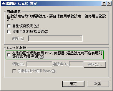 IE → 工具 → 網際網路選項 → 連線 → 區域網路設定