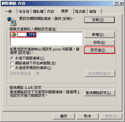 1) Internet Explorer 右鍵「內容」→ 「連線」 → 點選該「VPN連線」→「設定值」。